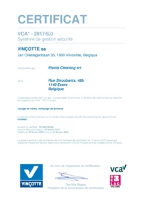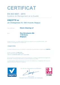 Fondée à Bruxelles en 2014, Elanis Cleaning est une entreprise familiale spécialisée dans l’entretien de bureaux, le lavage de vitres et les grands nettoyages. Soucieuse de la qualité, de la sécurité et du respect de ses collaborateurs, elle a investi dans des nacelles et un système d’eau osmosée pour réduire les risques en hauteur. Engagée dans une démarche d’amélioration continue, l’entreprise a obtenu les certifications VCA (sécurité), ISO 9001 (qualité) et ISO 14001 (environnement). Elle met également l’accent sur la formation de ses équipes afin de garantir compétence, sécurité et satisfaction client.