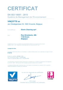 Notre processus de nettoyage est certifié ISO 14001:2015, garantissant un management environnemental efficace et responsable. Cette norme fournit un cadre reconnu permettant de réduire l’impact écologique tout en assurant des pratiques durables.